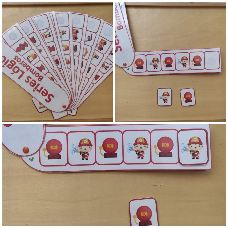 Os dejo otra serie lógica en formato llavero, por su comodidad para trabajar, aunque para guardar el material usamos unos sobres traslucidos de tamaño A5 para que no se pierdan las mini tarjetitas de imágenes. Las imágenes son de temática de bomberos.