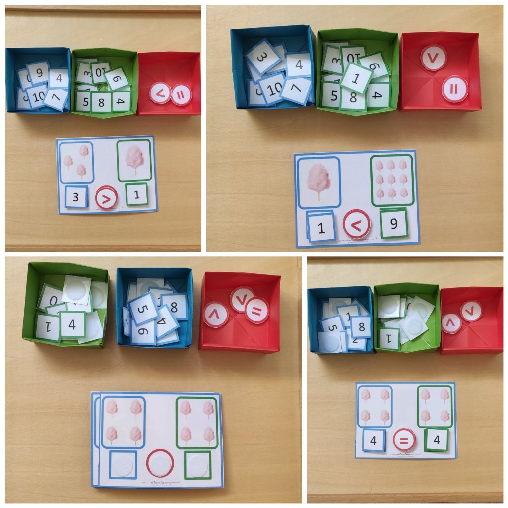Aprovechando el material de conteo con algodón de azúcar y las tarjetas con sumas sencillas vamos a ayudar a los peques a aprender a distinguir cuál es mayor o cuál es menor o si son iguales. Tendrán que identificar la cantidad de cada casilla, pegar el número debajo y hacer la comparación. Al poder hacerlo de forma manipulativa el aprendizaje será más significativo.