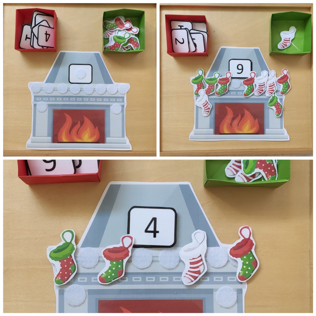 Para que los mas peques aprendan, consoliden y se diviertan con el conteo del 0 al 10 he creado varios materiales iguales pero con temática diferente. En este caso tenemos como tema principal la chimenea navideña y los calcetines colgados en ella. He jugado con A. a dos tipos de actividades diferentes: