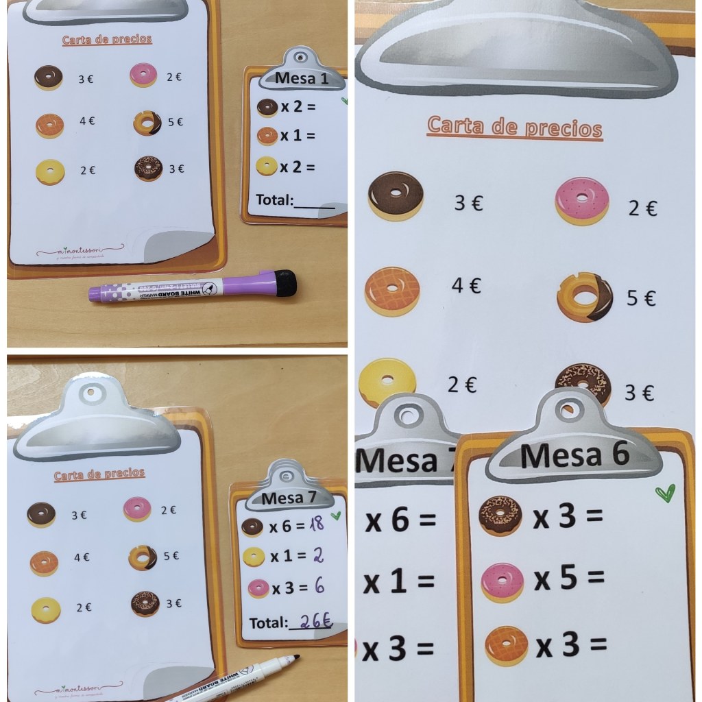 Hoy os propongo jugar a los dependientes, somos una tienda de donuts (muy cara, sí pero excelente 😀 ) Varias mesas nos hacen pedidos diferentes y, fijándonos en la carta de precios debemos calcular el total a pagar. Así vamos a practicar las tablas de multiplicar y las sumas sencillas con llevadas.